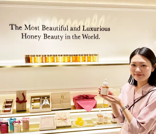 HACCIでは、まず私たち自身がはちみつを試食して、その良さをしっかり体感してからお客様におすすめしています。実際、自分で効果を実感しているからこそ、自信を持ってお客様にお伝えできるのが嬉しいですね。はちみつは保湿力が高くて、乾燥にもエイジングにも効くので、お客様のお悩みに合わせていろんな角度からご提案できることがやりがいです。