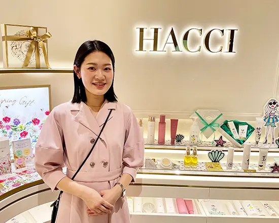 前職はメイク系ブランドで働いていました。自分がおすすめした商品を気に入って購入いただけることに、大きな喜びを感じていたのです。ただ、タッチアップを重ねるうちに「メイクの仕上がりって、結局は土台の肌で決まるんだな」って実感するようになりました。そこから、本格的なスキンケアを追求できるHACCIに興味を持ち始めたのがきっかけですね。