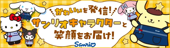 取材担当柳沼より **サンリオは“人柄”採用!** サンリオが好き、小さい頃サンリオグッズを集めていた、そんなあなたに朗報です。今回の募集は全国のサンリオショップ。Kawaiiキャラクターに囲まれながら、仲間はもちろん、サンリオ愛に溢れたお客様たちと毎日楽しく働けるチャンスです。人柄重視の採用なので、接客経験のない方でもOKとのこと。お客様が笑顔になれるお店づくりに、未経験からチャレンジしてみたい方にオススメです!