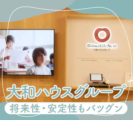 配属先の部署では30~50代の女性が中心に活躍中!みんなイキイキと働いています!フラットで穏やかなメンバーが多いので、とても居心地のいい環境です。 過去に営業職に携わっていた方はもちろん、営業未経験の方も積極的に採用中。事務・販売・接客など、人と接してきた経験・スキルを活かしながらご活躍いただけます! 資格取得のためのバックアップ体制も充実!※国家資格である「管理業務主任者(合格率20%程度)」については、1年以上在籍しているメンバーの84%が取得しています! 入社後には1ヶ月間の研修を実施!マンションの専門知識や「マンション管理とは?」という業務の基礎を学ぶことができます。そのほか議事録の作り方などもしっかりとレクチャー。安心してスタートできます! 業務のスケジューリングは自分次第。直行直帰もできるため、柔軟に調整しながら働ける環境です。 業務状況などにあわせて、自宅やカフェでのリモートワークも認めています! 分譲マンションにお住まいのお客様に安心して快適に暮らしていただけるよう、暮らしのトータルコーディネートを行います。自分の提案した企画が安心感や利便性の向上につながる、貢献度の高い仕事です! 大和ハウスグループの一員として、グループ内外の約4,300棟(270,000戸)以上の建物管理事業を展開しております。 デザインや使いやすさにこだわり、活発なコミュニケーションが生まれることを目的にオフィスの整備を推進しており、社内では「モチベーションオフィス」と呼んでいます。