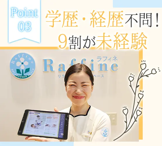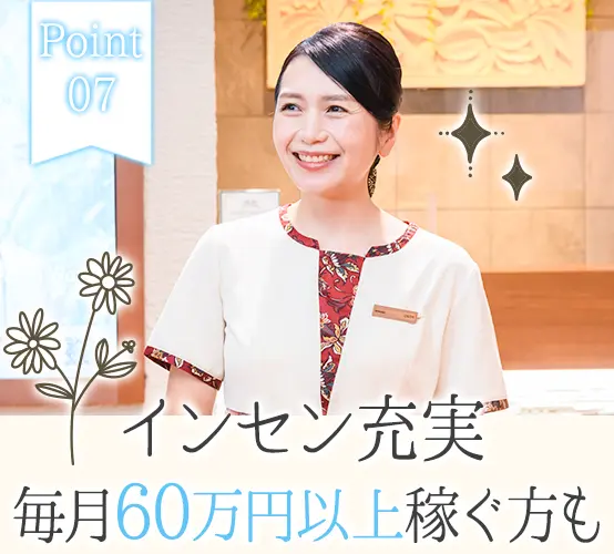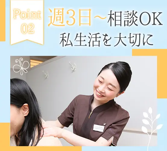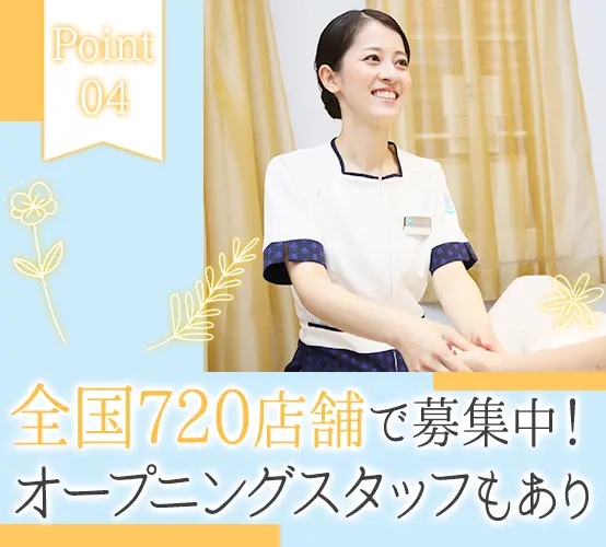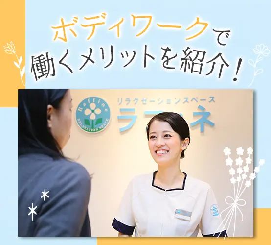 志望動機が固まっていなくても構いません!「話を聞いてみたい」という応募も歓迎しています♪ 施術の提供時間(分単位)に応じた給与をお支払いします。ビラ配りなどはなく施術のみに集中できるため、月収35万円、月収43万円など大幅な収入UPも叶います。 シフトは週3日~相談OK!(週に4日間お休みが取れます)長期休暇も取りやすく、海外旅行へ行くスタッフもたくさんいます。 研修センター「ボディワークアカデミー」にて、約1ヶ月間の研修を受けることから始めましょう。一緒に学ぶ同期は一生の仲間です☆ 現在、47都道府県全てへの出店を実現しています♪希望しない転勤・異動はありませんので、お住まいに近い店舗で働いてください!(全国に勤務地があるので、パートナーの転勤に合わせて働くことも可能です) 研修センター「ボディワークアカデミー」にて、約1ヶ月間の研修を受けることから始めましょう。一緒に学ぶ同期は一生の仲間です☆ 「今月は○○円くらい稼ぎたい!」という金額を入力すると、お客様の来店予測をベースにAIがシフトを設計。お客様の多い時間帯にも順番に入ることができ、平等かつ効率的に稼げます。 配属2年目で月収35万円、5年目で月収55万円も可能!毎月60万円以上稼ぐセラピストの方もいます◎ 人事や経理、広報まで、社員のほぼ全員がセラピスト出身。2023年からは、若手のセラピスト育成をするインストラクターもキャリアパスの1つに!あなたらしく、長く活躍できる当社へぜひいらしてください◎
