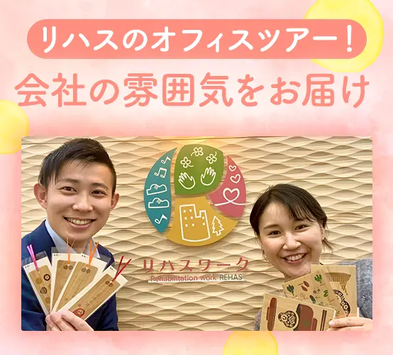 こんにちは!「どんな人が働いてる?」「どんな場所で働く?」など、テキストだと伝わりにくい、実際のリハスの雰囲気をお伝えしますね♪ 未経験の方や、社会人経験が浅い方も大歓迎です!ご利用者さまにとって難しかった作業ができるようになった喜び。そんな笑顔がやりがいにつながる、素敵なお仕事です♪ こちらは施設の様子!木目調で落ち着いた雰囲気です。障がいを持つ方の「働きたい」という想いを叶えるために生まれたリハスは現在、上場に向けて全国各地で事業拡大中! ご利用者さまを就労先までお見送り!「行ってらっしゃい!」のハイタッチです。 新拠点が続々オープン中!立ち上げスタッフとしてもご活躍いただけます。 ご利用者さまと一緒に作業スタート。ハサミの使い方、紙の折り方…日々、ご利用者さまのできることが増えていき笑顔が見られると、社員もとても嬉しい気持ちになります★ お昼休憩!ほっと一息タイムです。ちなみに、平均的に残業は少なく、18時までに帰っている社員がたくさんいます★ 午後の部スタート。引き続き、ご利用者さまのサポ―トを一緒にしていきます。 終業後は、社員みんなで、ご利用者さまの状況共有。次はあの作業をしたらどうかな?と、毎日ご利用者さまのことを考えています。「誰かの役に立ちたい」あなたのその優しさを当社で活かしませんか?