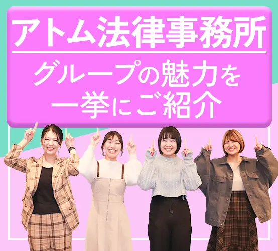 全国15拠点を構える弁護士法人「アトム法律事務所」を運営しています。今後も『法律』と『IT』を掛け合わせた事業で、より多くの方の依頼やお悩みを解決したいと考えています! 刑事事件・交通事故関連のWeb検索結果でシェア率トップクラス誇る、高い集客力が当社の特徴です!集客に困らないため、新しい事業もどんどん生まれています! 現在チャンネル登録者数は174万人を誇り、2022年~2024年までの3年間で再生回数30億回を記録。教育・社会系YouTuberで再生回数1位となっています。 業務に慣れないうちは先輩社員がすぐ横でサポートするのでご安心ください。風通しの良い環境なので質問や相談はいつでもできます♪ 法律事務所グループならではの安定感と働きやすい環境があるから理想のライフプランを実現できます! 祝日や有給などを組み合わせて、5日以上の連休取得も可能です!海外旅行なども楽しめます! 産育休制度や時短勤務制度完備/家族手当支給…などなど、ライフイベントを迎えても安心して働き続けられる環境が整っています! 人生を左右する法的トラブルに巻き込まれた方にお力添えする仕事。サポートを通じて人助けの実感とやりがいを感じられるポジションです。 その他にも働きやすさバツグンの待遇をご用意。「お茶・コーヒー飲み放題」「住宅手当や家族手当」など、各種手当充実など、福利厚生が充実!