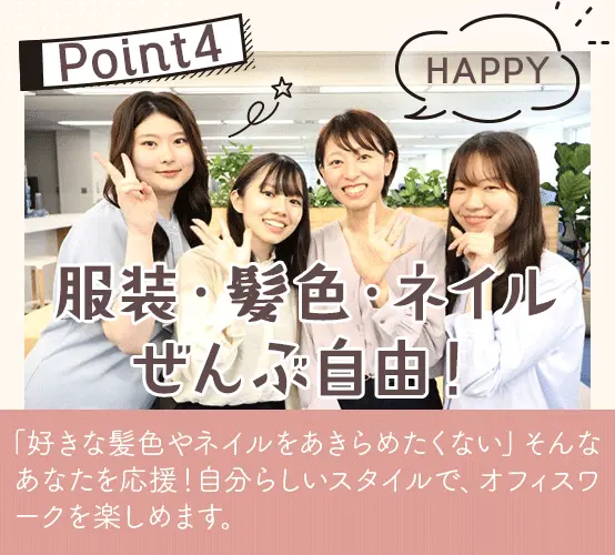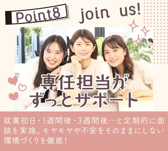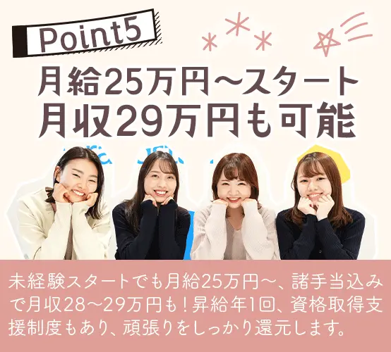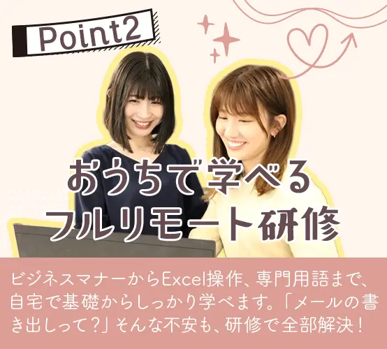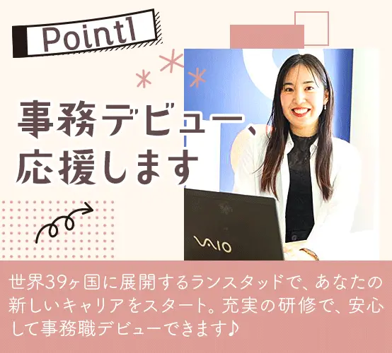 ランスタッドといえば充実の研修♪研修や定期的なフォロー制度をご紹介! 働き始める前の不安があっても大丈夫。未経験でもしっかりとした研修があり、安定した会社で専門性をGETできます◎ 入社後しばらくは、自宅で受講可能な研修プログラムが整っています。 オンオフのメリハリをつけて働けます!私生活も大切にできる環境です♪ 同世代のメンバーもたくさん活躍しています!一人ひとりの状況に合わせて柔軟にサポート。活気あふれる環境で働けます♪ 事務でスキルを磨く以外にも、将来の選択肢も豊富!キャリアアップを目指せる環境です。 5年後、10年後も長く働ける環境があります。ランスタッドのプログラムで、長期的にあなたのキャリアアップをサポートしています! 自分らしいスタイルで自由に働けるのが魅力です!あなたはどんなスタイルで働きますか? 研修初日から定期的な面談を実施。あなたの悩みや不安を専任のフォロー担当が支えていきます。