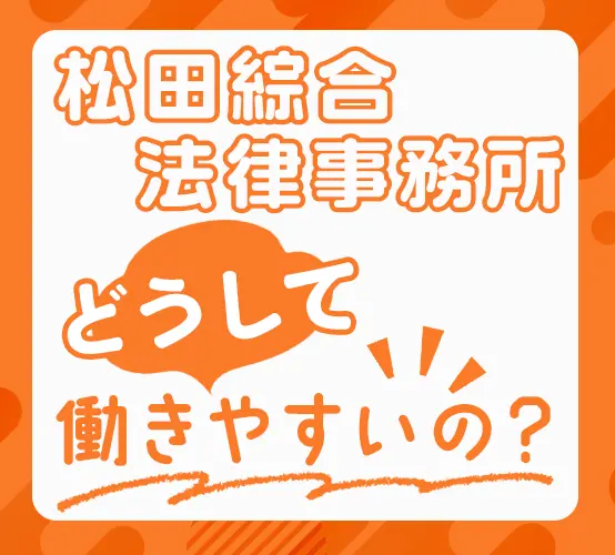 松田綜合法律事務所では、高い定着率を継続中!実際に社員から好評な「働きやすさ」をご紹介します♪ 優しい先輩社員ばかりなので、わからないことがあっても気軽に質問できます◎実際に転職した方から「今までの職場より過ごしやすいです」と声を聞くほどです! 社員の中には産育休を2回取得し、復帰した社員も活躍中!ライフイベントを経ても、長く安定して働ける環境です。 社内ではオフィスカジュアルで勤務OK!Tシャツで勤務している方も多く、過ごしやすい服装で働けます。 リモートや時差出勤・時短勤務など、プライベートに合わせて働き方を選択可能!詳しくは面接時にご相談ください。 残業は月10h程度!基本的には定時で退勤できるため、退勤後の時間にも余裕があります。 夏季休暇や年末年始など長期休暇もご用意!家族との時間や自分の趣味の時間をしっかりと確保できます。 法律事務所の規模としては日本の中では上位50位に位置しているなど、安定した経営基盤が整っています! 月給に加えて豊富な手当・待遇をご用意!安定収入が手に入るからこそ、日々の生活もより豊かになっていくはずです◎