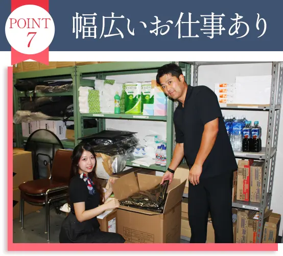 座り仕事だけではなく、グッズの品出しや裏方の作業も担当します!必ず男性の営業担当が手伝ってくれるので、ご安心ください!