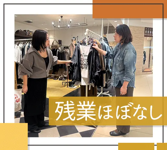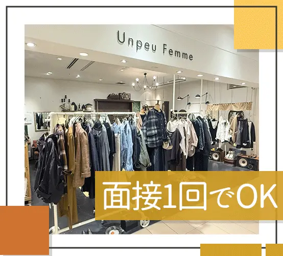 ご相談に応じて1次でWEB面談も可能!堅苦しい志望理由・面接準備は不要!気軽にお話しましょう♪ アンプーファム【Unpeu Femme】のスタイリングをご紹介♪<その1> しっかり収入UPが目指せます♪月収例:31万3000円(月給27万3000円+予算手当+個人売上手当) カジュアルかつ女性らしさも併せ持つファッションをテーマに、東京はもちろんヨーロッパ各国からも、たくさんのアイテムをセレクトしています! アンプーファム【Unpeu Femme】のスタイリングをご紹介♪<その2> 賞与に加えて、店舗の予算達成手当(月1万円)&個人売上手当(月3万円)あり!頑張りがしっかり還元されます◎ 残業は月10時間ほどとほぼありません!仕事終わりのプライべートも満喫できますよ。 アンプーファム【Unpeu Femme】のスタイリングをご紹介♪<その3> 平均年齢30.5歳!落ち着いたトーンで、じっくりお客様に向き合った接客ができます◎