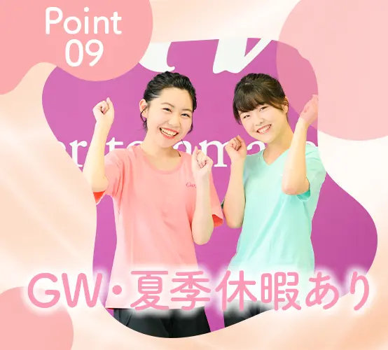 8割以上が未経験スタート。未経験でも本部研修+OJTで基礎から習得。標準トークとロープレで不安場面を事前に練習し、現場で自信を育てます。 上場グループの安心感が、日々の挑戦を後押し。 経営基盤が安定しているから、未経験でも丁寧に学び、成果を評価につなげられます。 日祝休+他1日の週休2日に、産育休・育児短時間勤務など制度も整備。無理なく続けやすい働き方で、接客の力を磨けます。 月給26.1万円〜/昇給年2回・賞与年2回——接客・フィットネス系でも安心感のある“高水準”の給与レンジです。 直近実績で育休復帰率ほぼ100%。ライフイベントに合わせた働き方(時短・シフト配慮)で、安心してキャリア継続が可能です。 リスタートの方も多数!研修は講義だけではなく、映像やディスカッションを使って楽しく学べます。オンライン研修もあるため、復職・職種転換の方も無理なく再スタート可能です。 産休・育休制度や時短制度が充実しているため、育児をしながらでも、コーチとしてスキルを積むことが可能です。 産休・育休制度や時短制度が充実しているため、育児をしながらでも、コーチとしてスキルを積むことが可能です。 週休2日(日・祝+他1日)に、GW・夏季・年末年始の長期休暇を加えて年間休日は120日以上。有給・慶弔・産前産後・育児・介護休暇も整い、連休取得や行事対応のシフト調整がしやすい環境です。