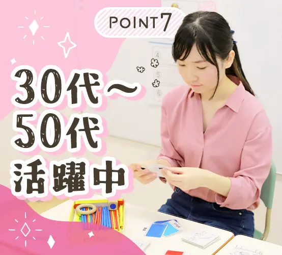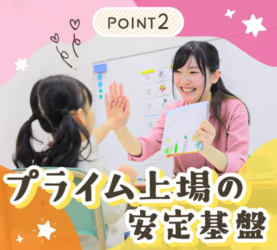 充実の研修(座学・OJT・フォローアップ)があり、未経験でも安心です。実際、アパレルや飲食など異業界出身の先輩も活躍中。「子どもの力になりたい」という想いがあれば、資格や実務経験がなくても歓迎します! 東証プライム上場企業ならではの安定感もバッチリ。従業員持株会や確定拠出型年金制度、さらに定年制度廃止など、将来も安心して働ける体制が整っています。 月8~10日の休みに加え、有給休暇、夏季休暇や年末年始休暇もしっかり取得できます。プライベートの時間も大切にしながら、メリハリをつけて働ける環境です! 指導員は月給25万3400円からスタート(東京・神奈川は更に優遇あり)。年2回の賞与に加え、昇給制度もしっかり整っています! 産休・育休の取得率は100%。復帰後は時短勤務も可能で、制度は最長で小学校就学前まで延長できます。お子さまの行事や急なお迎えの際も、スタッフ同士で助け合う風土が根付いています◎ 業は月平均20時間以下。ITシステム導入で指導記録やノウハウを共有し、教材作成の負担を軽減。授業準備が効率化され、スタッフ間の引継ぎもスムーズなため、持ち帰り仕事やサービス残業はありません! 40代・50代のスタッフも多数活躍中です。キャリアパス例では、40代女性が指導スタッフからエリアマネージャーへ昇進した実績も。家庭と両立しながら、年齢に関わらずキャリアを築けます◎ 年間最大7日間の「ライフサポート休暇」を付与!1時間単位で柔軟に取得可能。通院や役所手続き、家族の用事などに活用できます。 カリキュラムや学習方法を完全オーダーメイドで作成。好きなことや得意なこと、すなわち“個性”に合わせた教育を大切にしています。自分のアイデアを活かし、一人ひとりの可能性を拡げる支援ができます。
