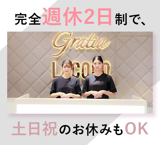 面接1回・Web面接OK・履歴書不要!最短1週間で内定。「美容が好き」「キレイになりたい」その気持ちがあれば大丈夫。一緒に理想の毎日を叶えませんか?今すぐ応募を♪ 10日間の基礎研修+OJTで、美容知識も施術技術もしっかり習得。先輩が個人のペースに合わせてサポートするから、業界未経験でも安心してスタートできます! 美容脱毛もエステも無料で受け放題♪コスメは社割でお得に。LACOCO・銀座グラティアなら、お仕事しながら自分磨きが叶います。未経験から月収30万円も可能です! 月給25万円スタート(勤務地による)+プチボーナス+賞与あり。ノルマなしで安心、頑張り次第で収入UPも!入社2年目で年収600万円の先輩も在籍しています◎ 10時出勤なら19時退勤が基本!完全予約制だから急な残業はほぼなし。月平均残業10時間前後で、仕事後は自分の時間をたっぷり楽しめます♪ 土日休みも相談OK!年末年始・夏季休暇・バースデー休暇もあり、有給と組み合わせて海外旅行を楽しむ先輩も。プライベートもしっかり充実できます。 最新ルミクス脱毛機を使った全身脱毛が、スタッフなら何度でも無料!エステも受け放題で、自分自身がキレイになりながら、お客様にも自信を持ってご案内できます! メーカー直営サロンだから、最新の脱毛機器もコスメも、発売前にいち早く体験!美容のプロとして、自分が試したものをお客様にご案内できます。 「肌がキレイになった」「自分に自信が持てた」先輩スタッフの声多数!最新美容を日常的に試せる環境だから、仕事をしながら理想の自分に近づけます。