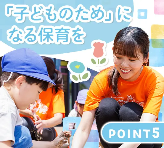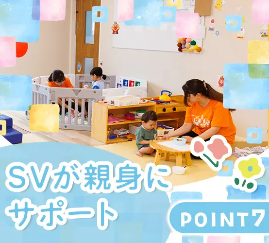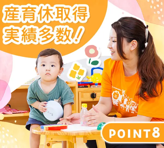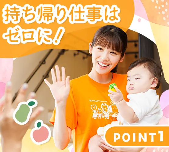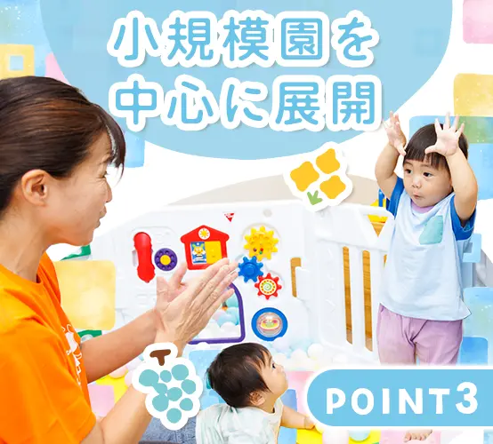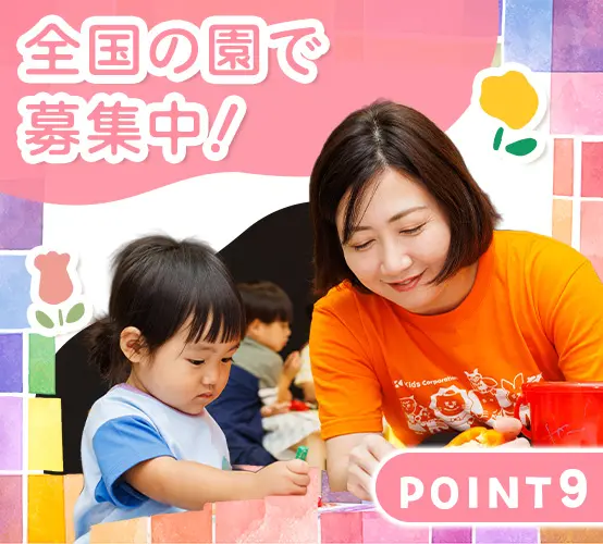 自宅に仕事を持ち込むことがないように、ITを活用して業務の効率化に力を入れています。 体力よりも「見守る目」や「包容力」が活きる小規模保育だから、ベテラン層も無理なく活躍中。定年後も働き続けられる環境で、長くキャリアを築けます。 0~5歳児を中心とした少人数保育だから、焦らずゆったりと、子どもの成長を見守れます。 保育士としての経験が浅い方でも大丈夫。園長をはじめ、安心して仕事に慣れていけるようサポートしていきます。 一斉行動を強制するのではなく、「どうしたい?」と問いかける保育です。指示出しで疲弊するのではなく、子どもの成長を発見する喜びに満ちた毎日があります。 「嘔吐処理の手順」「アレルギー対応」など、今さら聞けない基礎知識も動画で完備。ブランクがある方も、隙間時間に自分のペースで感覚を取り戻せます。 月1回以上は必ず園を訪問し、現場の先生一人ひとりの悩みや相談にじっくり耳を傾ける体制を整えています。 育児と両立して働く方も多数!ライフイベントに応じて、パートに働き方を切り替える、ということも可能です。 創業30年以上、全国で330以上の園を運営する安定基盤も。家の近くで安心して働ける環境が整っています。