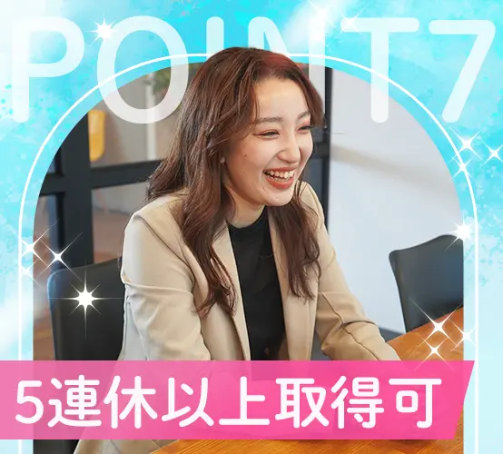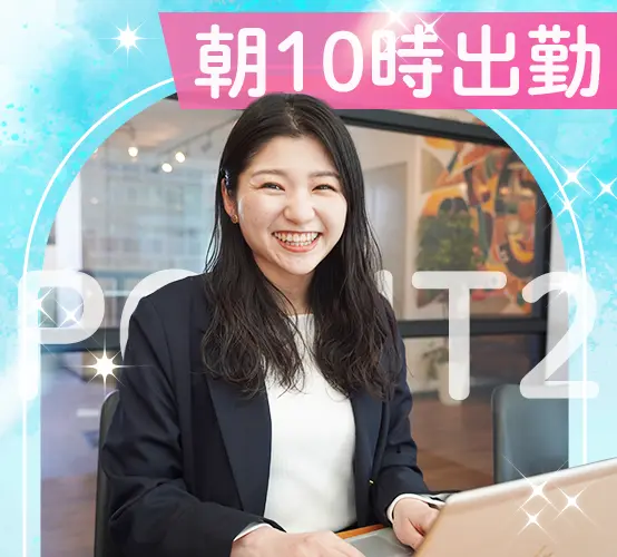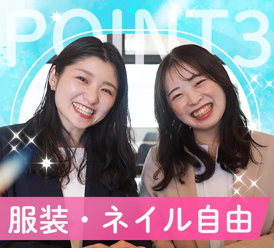 平均年齢27歳と若手が中心となって活躍する当社。今回はその中でも女性社員に、当社で働く魅力をインタビューしました! 残業はほとんどなく、ジムや習い事に通ったり、友人と食事を楽しんだりと仕事終わりの時間も楽しめます! 10時出社とゆっくりめのスタートなので、満員電車を避け、ゆとりをもって朝を始められます! 金髪やデニムもOK!髪色やネイルなどおしゃれを楽しみながら働けます! お休みを取りやすいので、平日に「病院や役所の手続きを済ませたい」「推しのライブに行きたい」などプライベートの時間を大切にした働き方が叶います! 完全週休二日制(土日)+祝日休みで、休日に会社から連絡が来ることもありません!オンオフのメリハリをつけて働けます! 復帰後も安心して続けられるよう、リモートや時短勤務、フレックスタイム制など、一人ひとりの状況に合わせて柔軟に対応しています◎ 夏季休暇(5~7日)と年末年始休暇(5~7日)があるので、長期休暇で旅行へ行く社員も多数います! 第二新卒・社会人デビューも歓迎!先輩たちの温かいサポートのもと、安心して未経験からスタートすることが可能です!