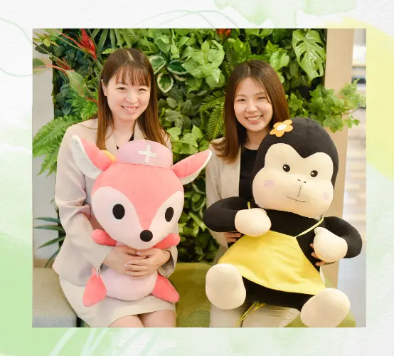 当グループのマスコットキャラクターと。社内はリラックスしていて居心地の良い雰囲気です。